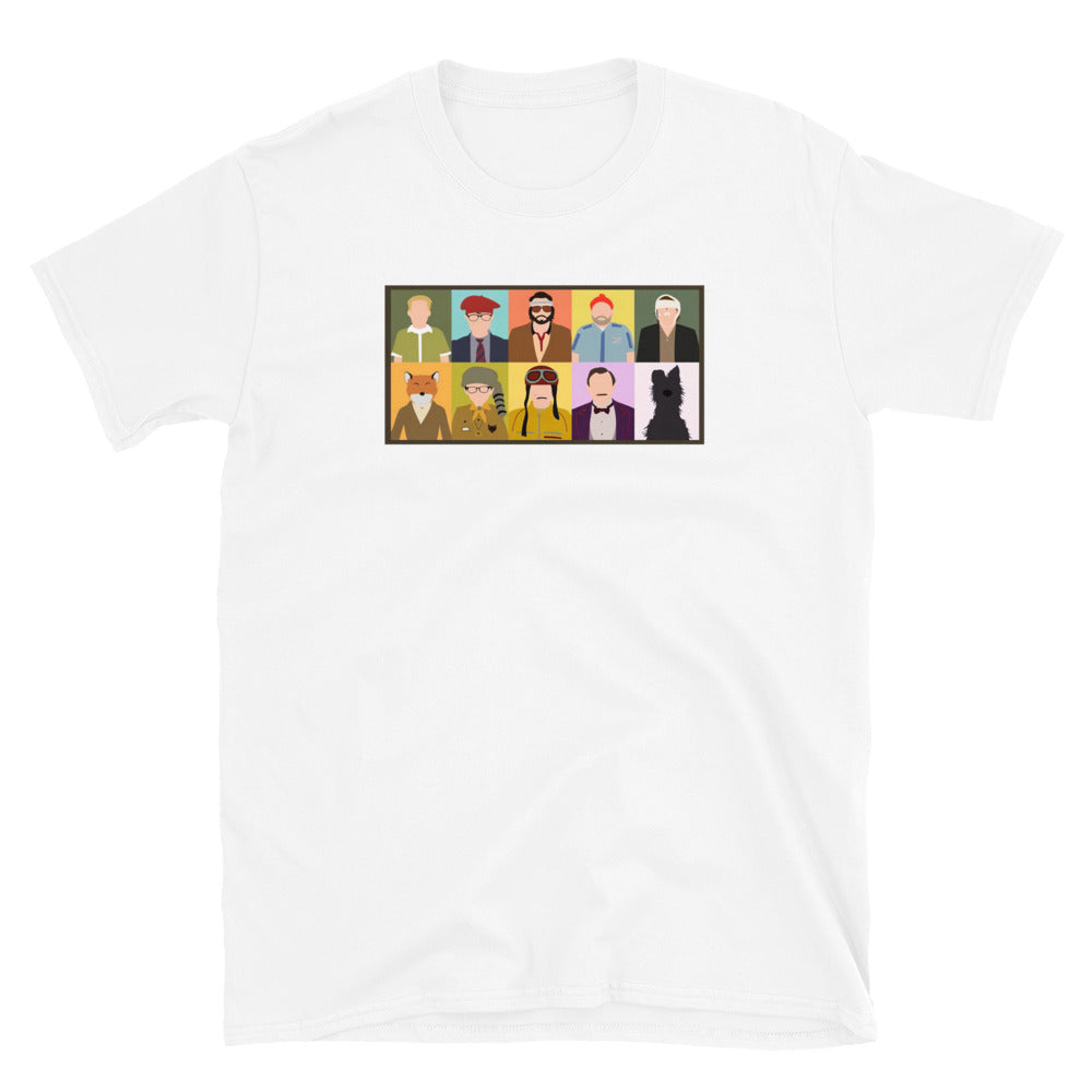 Step into the cinematic world of Wes Anderson, all in one shirt. This T-shirt brings together his most beloved characters, from Monsieur Gustave and Mr. Fox to Steve Zissou and Francis in The Darjeeling Limited, in a colorful collage straight out of his cinematic universe.